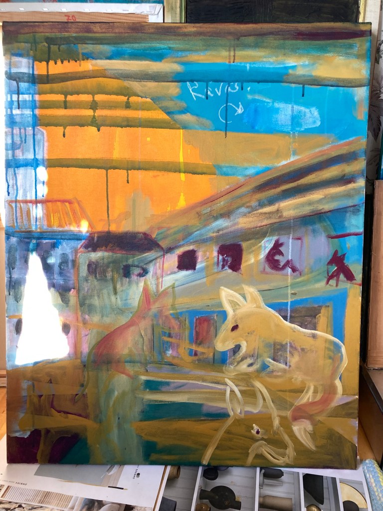börjar med grundning av gamla dukar från grovsoprummet med de sista färgslattarna från vägg- och takmålning.