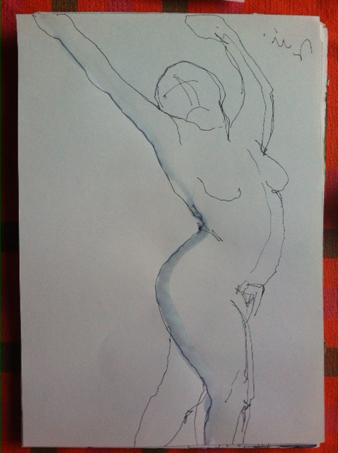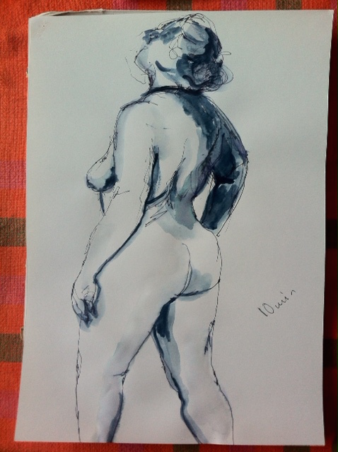 Dags för kroki på Mäster Olofsgården igen. Den här gången var det lite trångt. Det gick sådär, var lite okoncentrerad. Men några hyfsade teckningar blev det. Testade att blanda tuschpenna med lite akvarellinslag för att piffa upp de längre ställningarna. Ganska nöjd med resultatet.