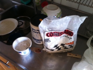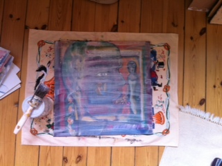 Här är en tavla jag inte blev nöjd med, nu ska den målas över, här är efter första lagret. Och förberedelserna inför ihoprörandet av smeten som jag använder. Receptet är som följer och är i första hand tänkt för att använda som grund på duk eller papper: