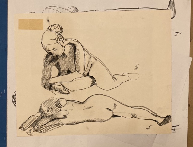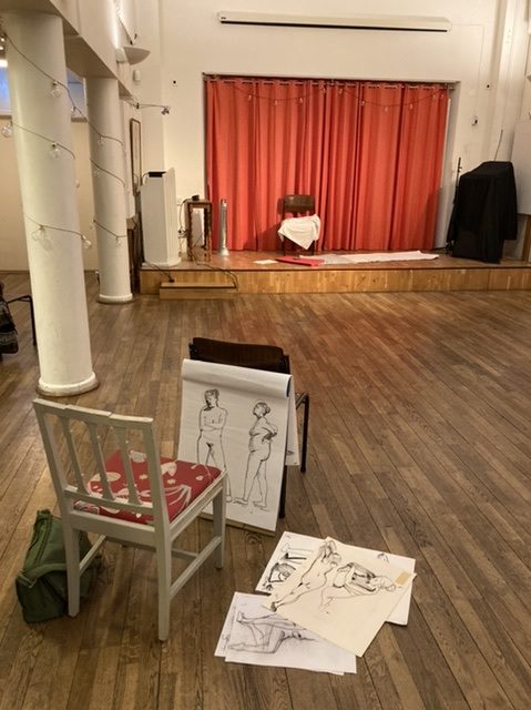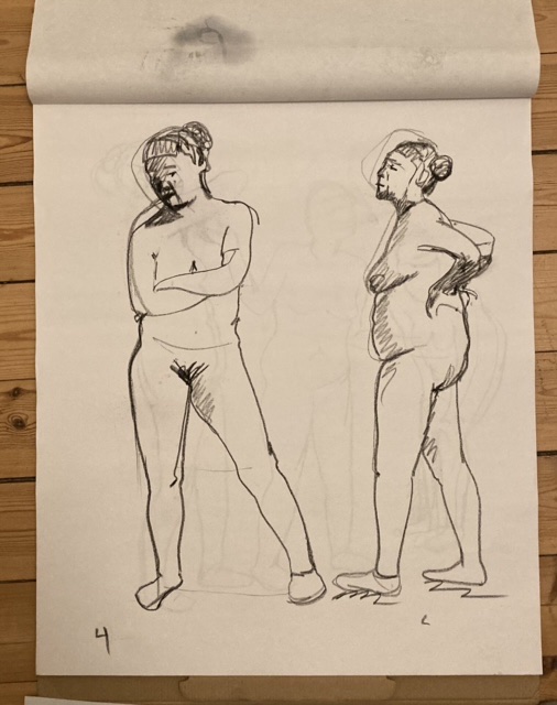 Så började terminen i alla fall till sist på ett av mina tecknarställen, jag missade till och med första gången som var förra veckan på Timmermansgården. Vi var en mycket gles skara. Jag hittade ett slags blädderblock i grovsoprummet som jag tecknade på, stort och bra. Därutöver lite återanvändning och baksidan på en affisch. Valde kol av lite olika hårdhet.
