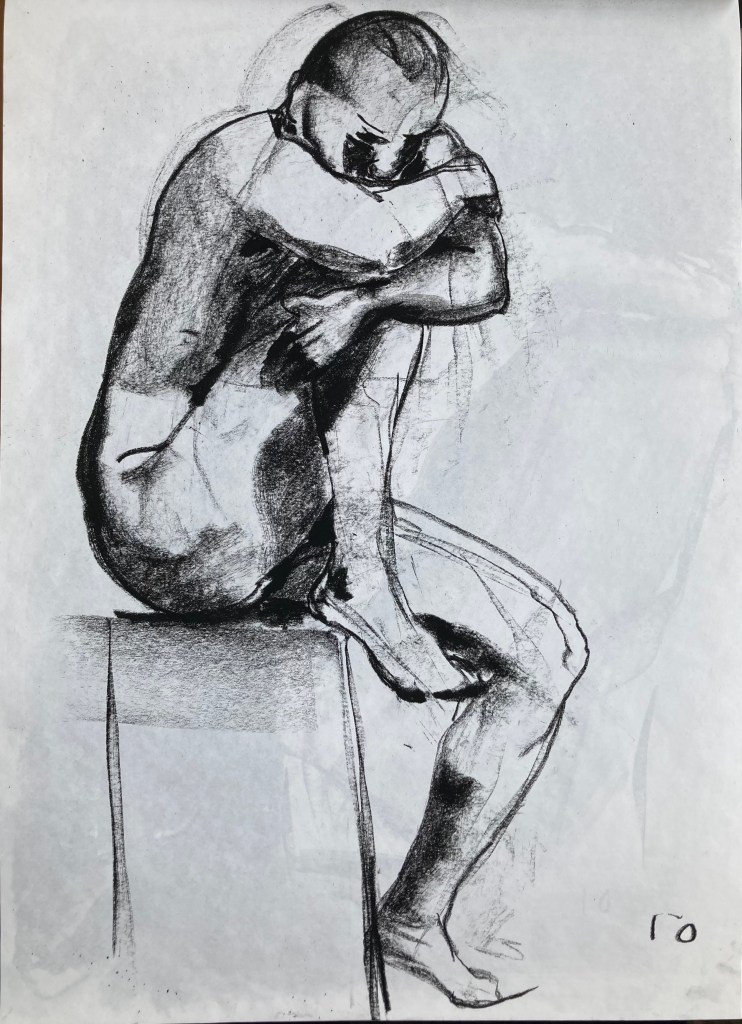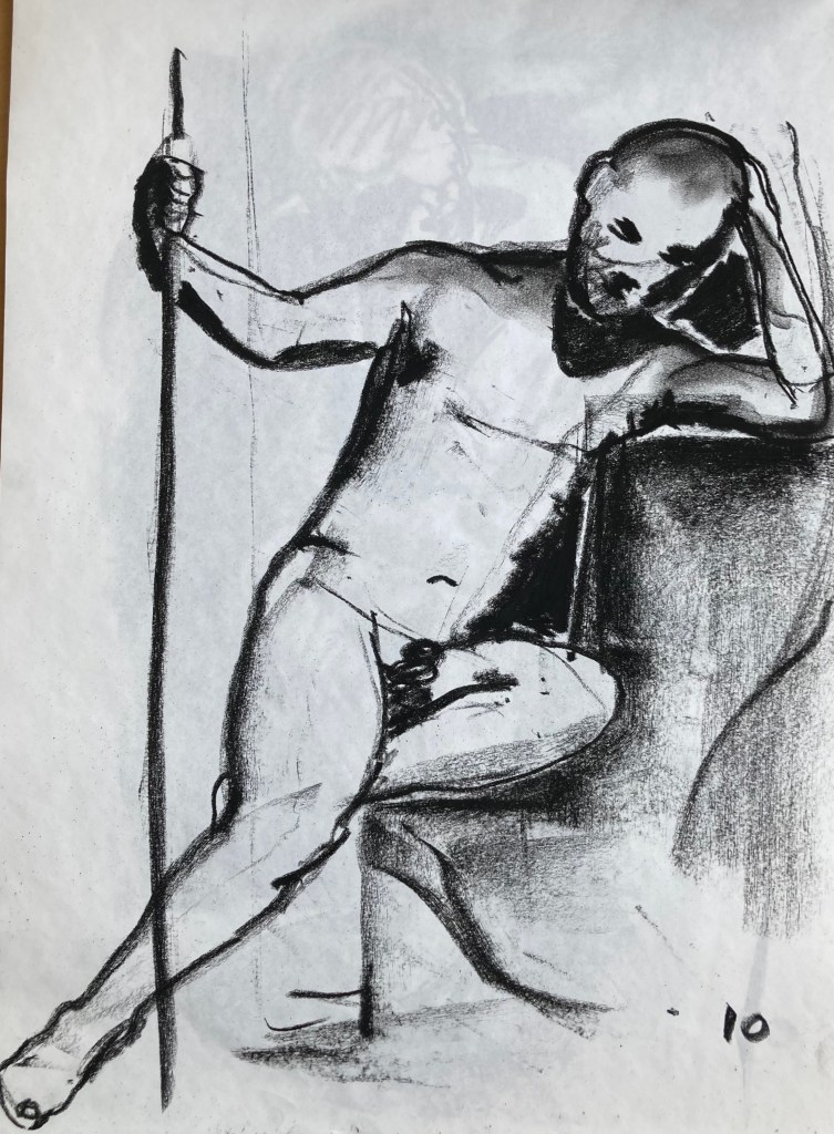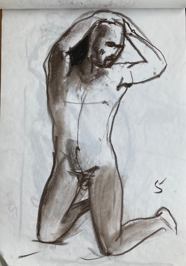 Det är kul att teckna någon annanstans ibland, det är lite olika stil på olika ställen. Här var jag på Fine art academy. Det var tre timmar på en fredagskväll, ganska långt, och på slutet två långa 20-minutersställningar som jag inte var materiellt rustad för så jag jag gjorde ett par teckningar på varje. Lite småstökigt också, det var inte så mycket folk men merparten tillhörde en möhippa…