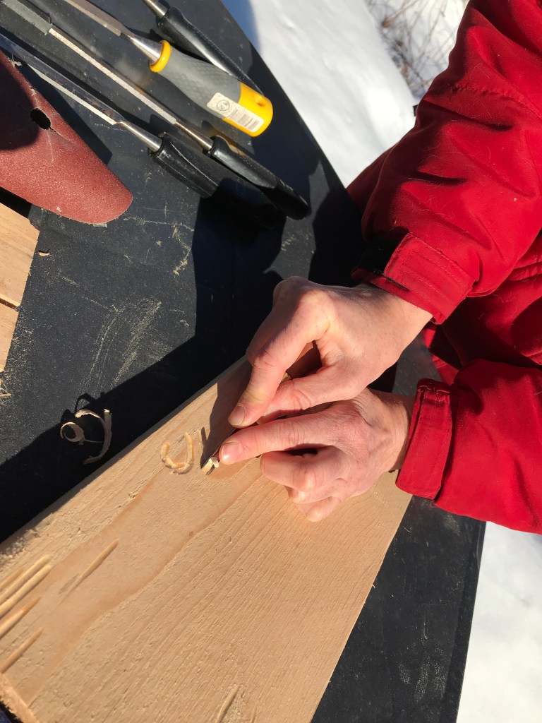 Till sist fick jag ändan ur vagnen och inskaffade ett par knivar för träsnitt, kanske måste det bli fler men jag har ett gäng mindre bra som delvis kan funka. Här några bilder av provsnittande på plankbit.