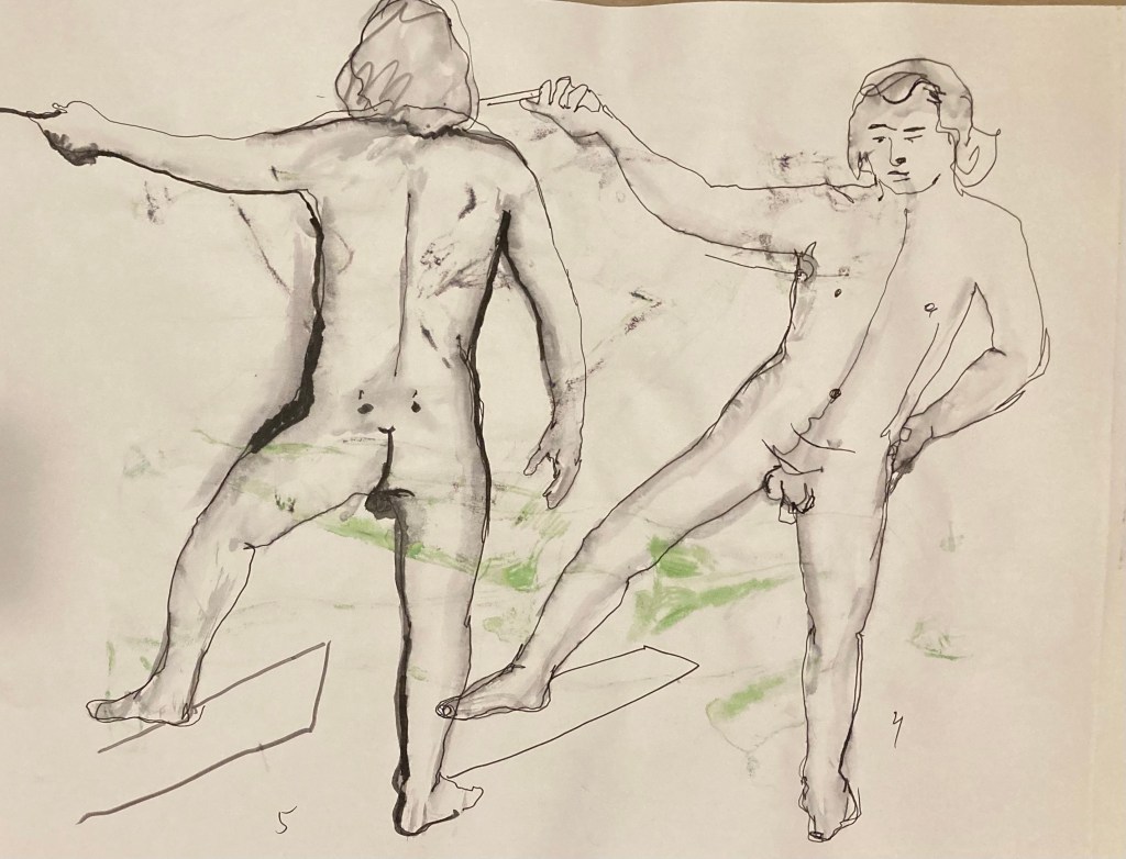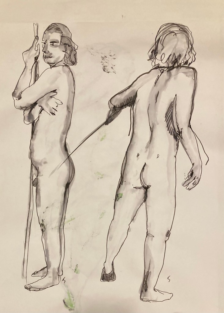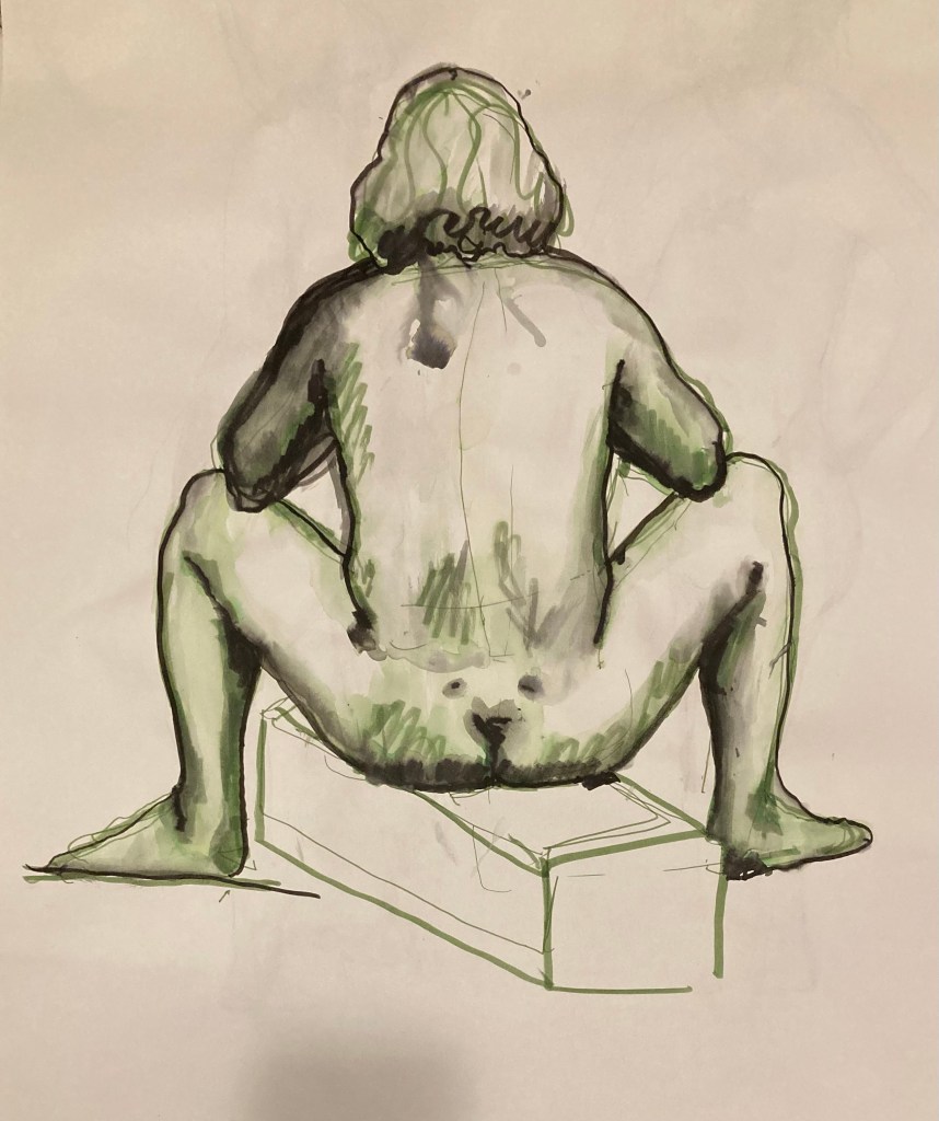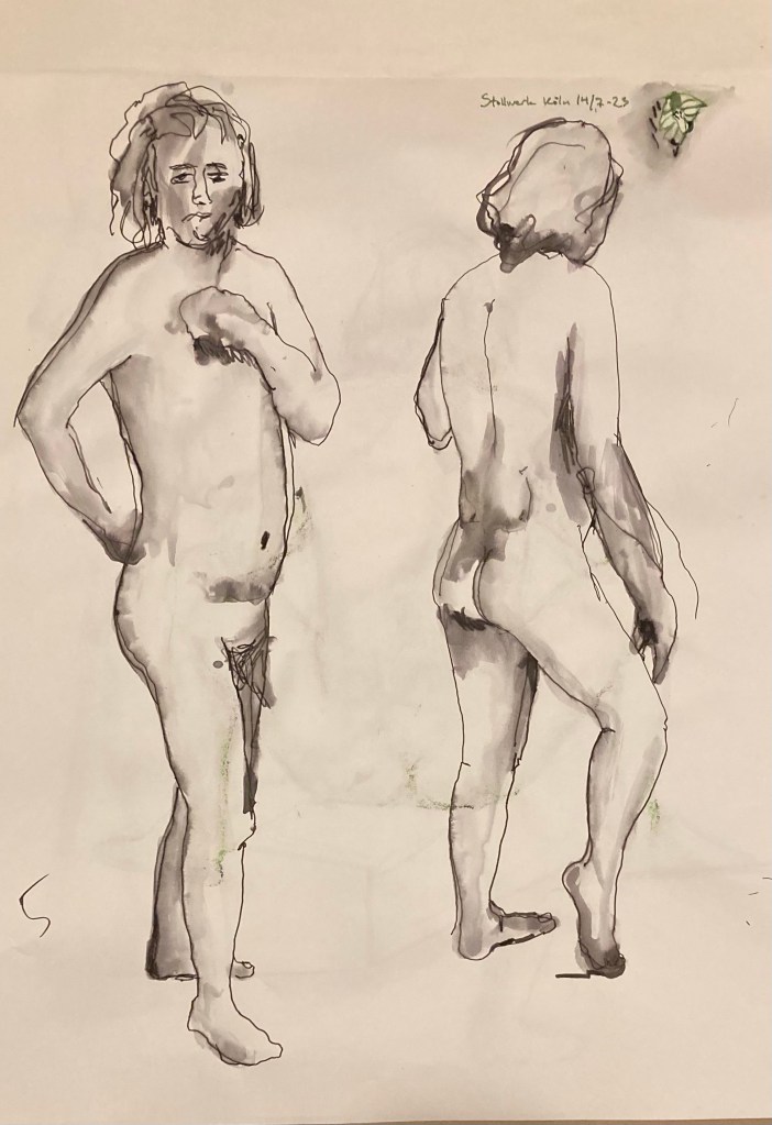 Det är alltid kul att teckna på nya ställen, kulturen är både lik och olik. I Tyskland är det oftast lite längre ställningar som dominerar, här på Stollwerk Köln höll vi också på ganska länge, 2,5 timmar i värmen under glastaket. Jag hade köpt nya akvarellpennor och lösblad dagen till ära. Den gröna pennan var inte så bra, åtminstone inte på vanligt teckningspapper. Som vanligt blev de långa (15 minuter) antingen misslyckade eller likvärdiga de kortare. Borde ha fokuserat de sista tio minuterna av de ställningarna på fötterna som var roliga.