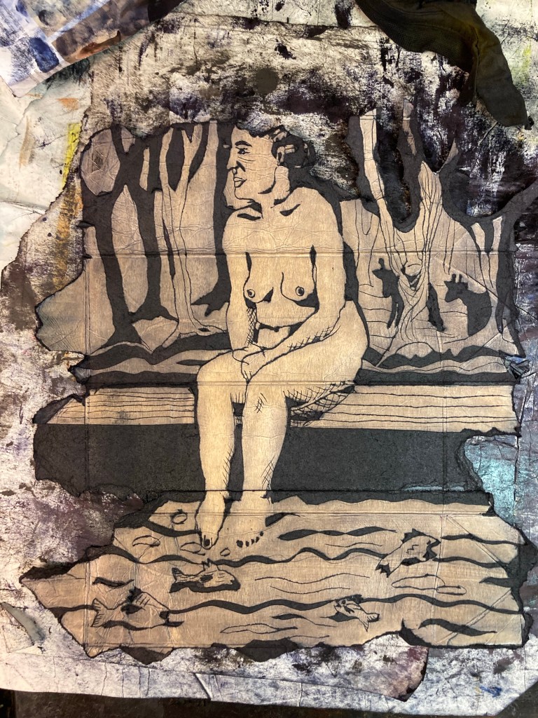 En ny ristad filkartong med ursprung i en krokisession på Konstnärshuset i våras. Jag hade med mig en hög kartonger och ritade direkt på dem med varierande framgång. Den här passade fint för ”Baderskan”. Det finns en till liknande, så kanske kommer Baderskan 2 inom kort.