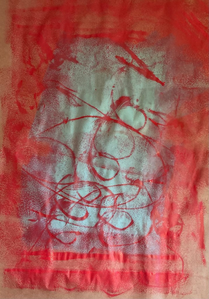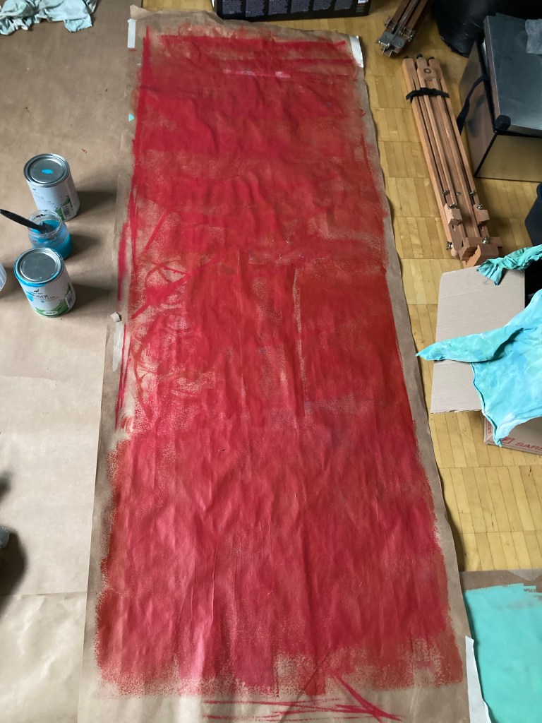 men jag kunde inte låta bli att förbereda lite för framtida måleri under väggmålandet. Återanvändning av golvpapp på gång, här med överskottsfärg vid rensning av penslar och roller. Till sist ett arkeologiskt dokument av tapeter från fyra årtionden, tyvärr hade jag hunnit riva bort den senaste redan. Gillar den längst in.