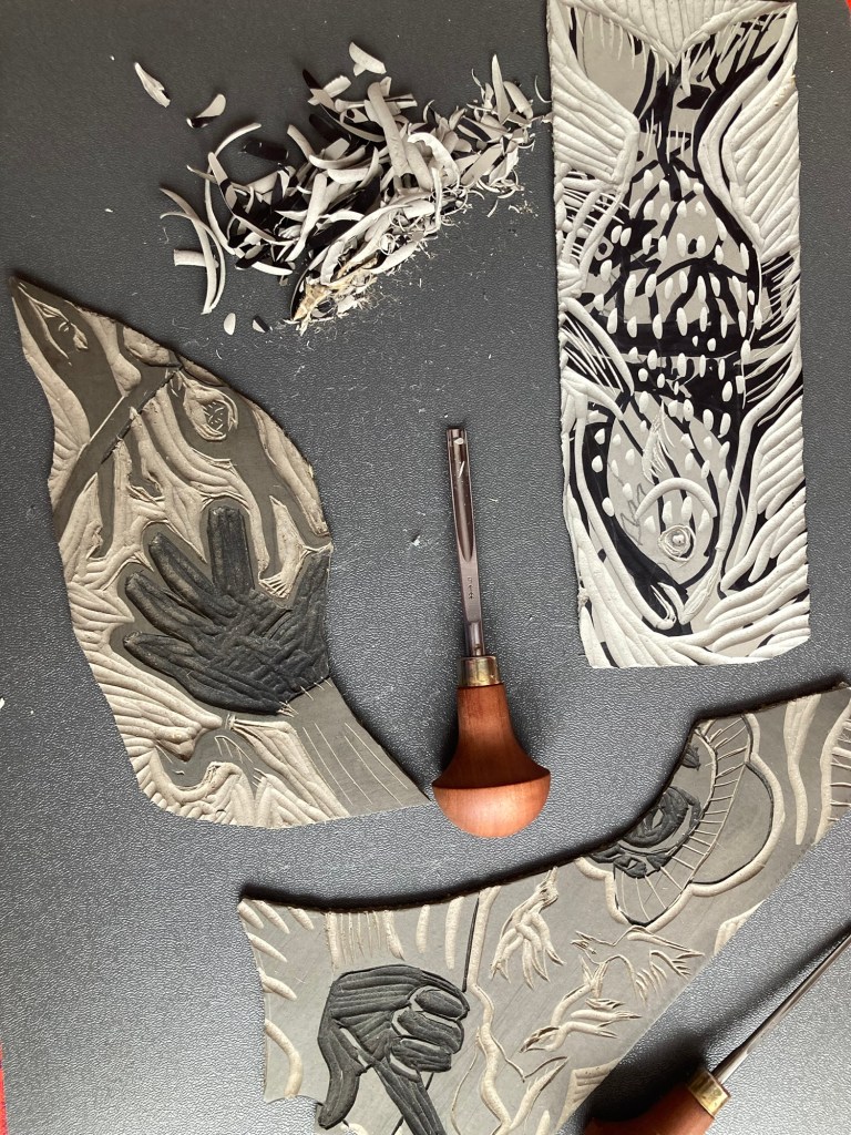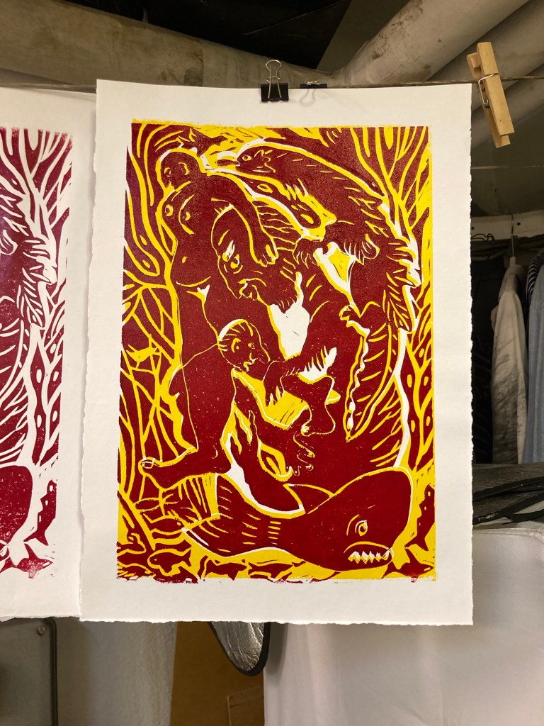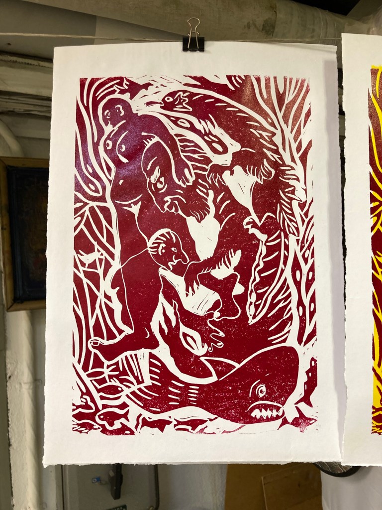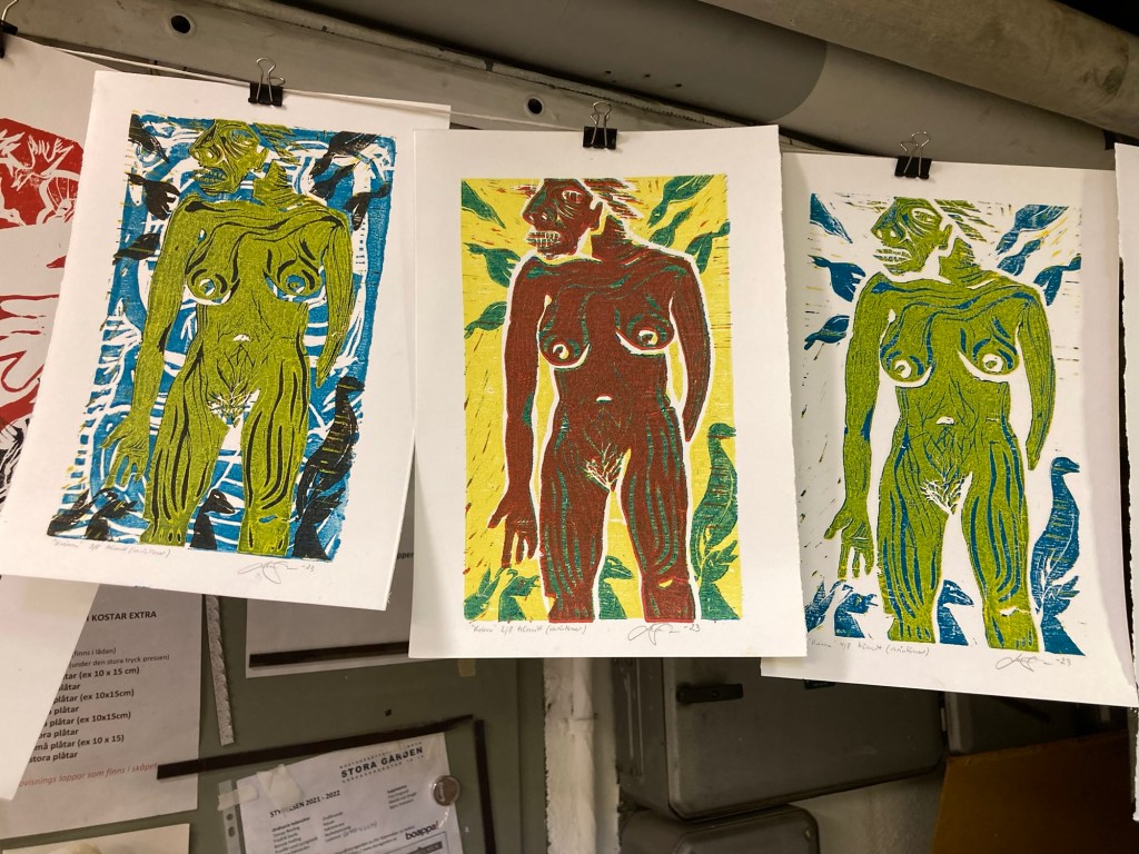 Det har blivit lite tryckt i verkstan! Lino och tetra, allt med särskilda syften i åtanke. Linotrycken i flerfärg saknar det sista lagret. Det är en förlorad platta så det gäller att tänka efter innan mer skärs bort. Hur många ex vill jag ha!? Och vad ska jag ha firren till!?