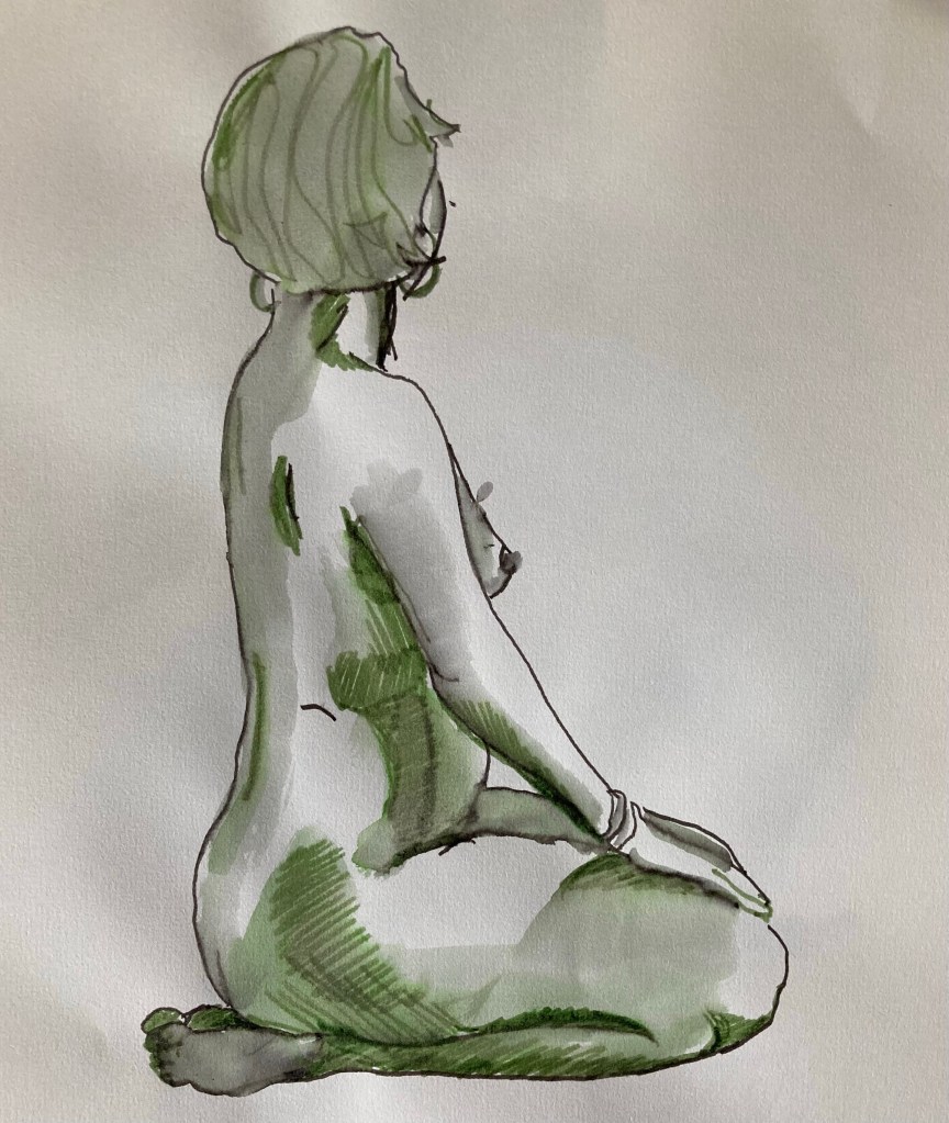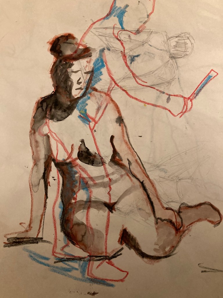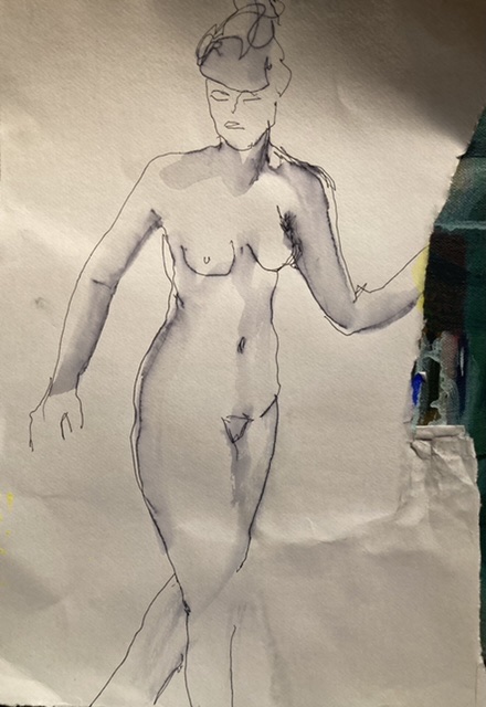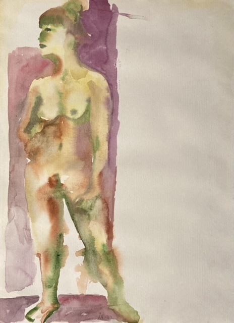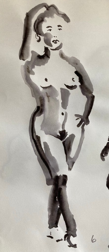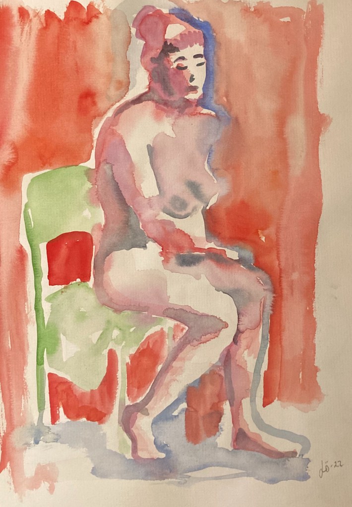 hos Sista styverns konstförening i SK:s regi. Det var mysigt och lite märkligt att bli bjuden på kroki i det lilla trähuset vid Stigbergsgatan. Mycket intimt och nära med en modell som verkligen fyllde det lilla rummet. Det var långa ställningar! Tur att jag hade med akvarellådan. En del blev usla, så blir det ibland när det är för långt, de behöver ni inte få se.
