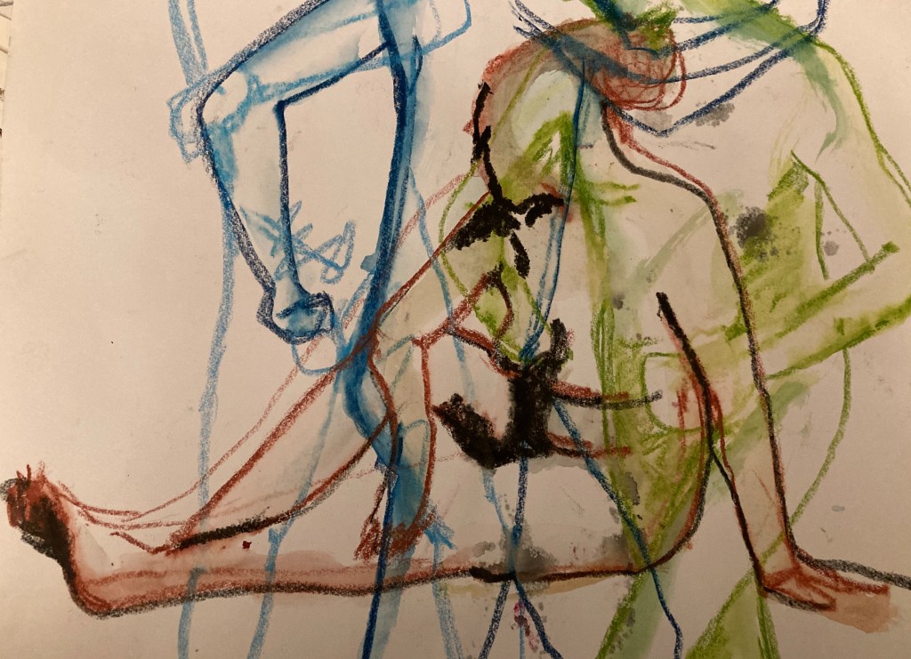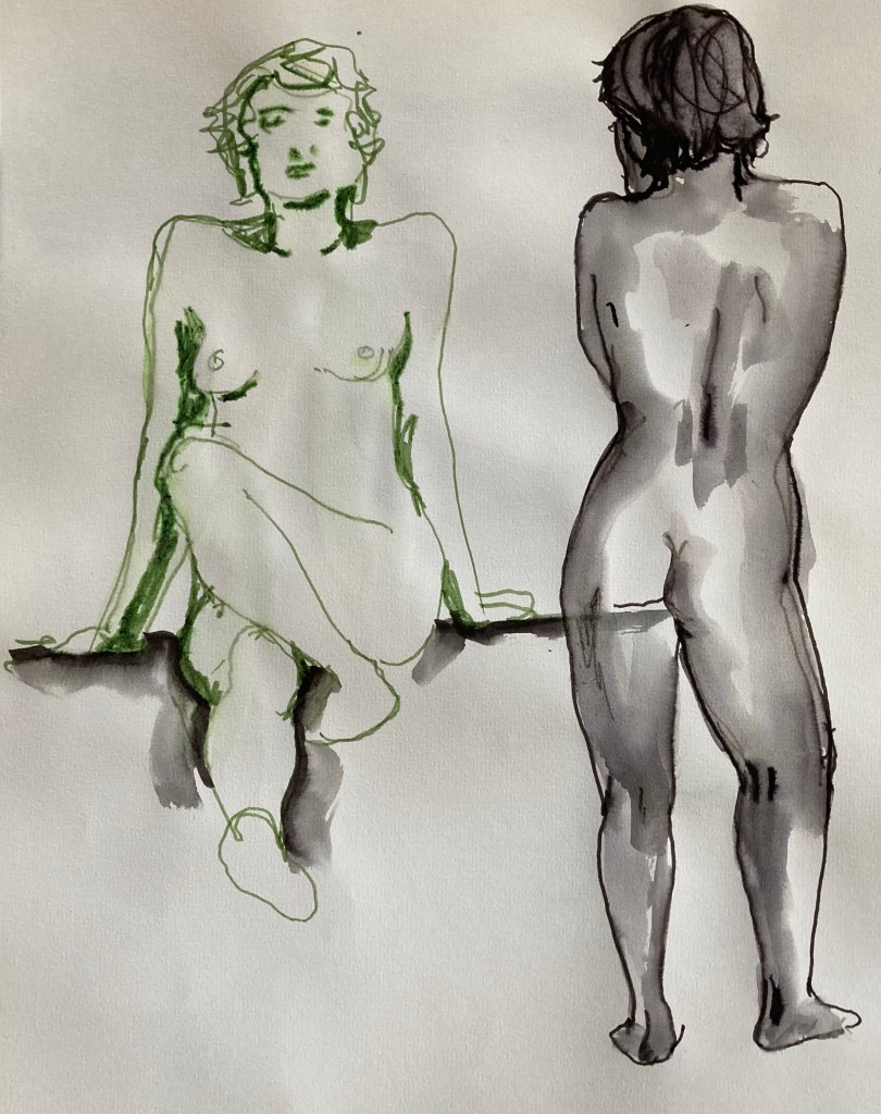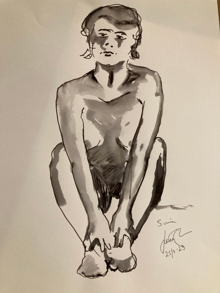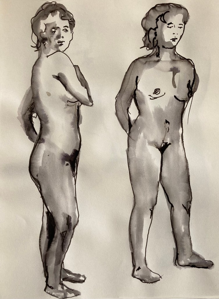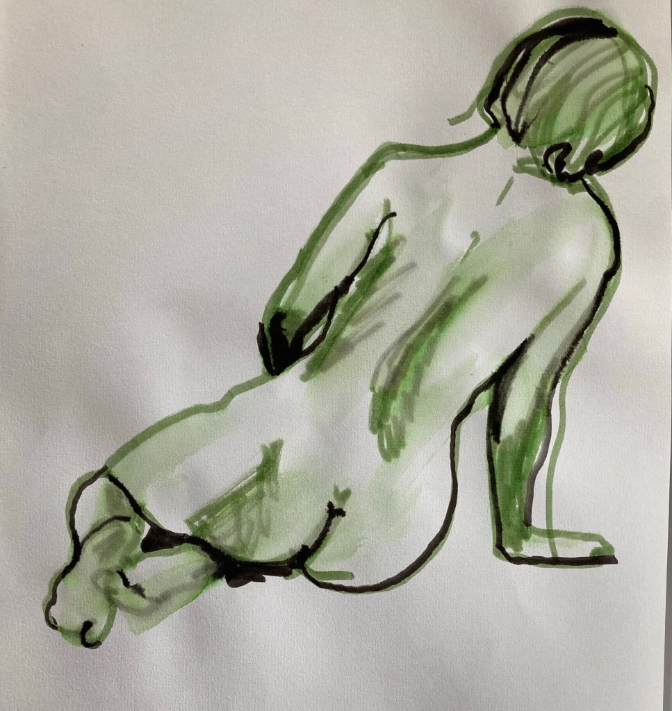 hos Sista styverns konstförening i SK:s regi. Det var mysigt och lite märkligt att bli bjuden på kroki i det lilla trähuset vid Stigbergsgatan. Mycket intimt och nära med en modell som verkligen fyllde det lilla rummet. Det var långa ställningar! Tur att jag hade med akvarellådan. En del blev usla, så blir det ibland när det är för långt, de behöver ni inte få se.