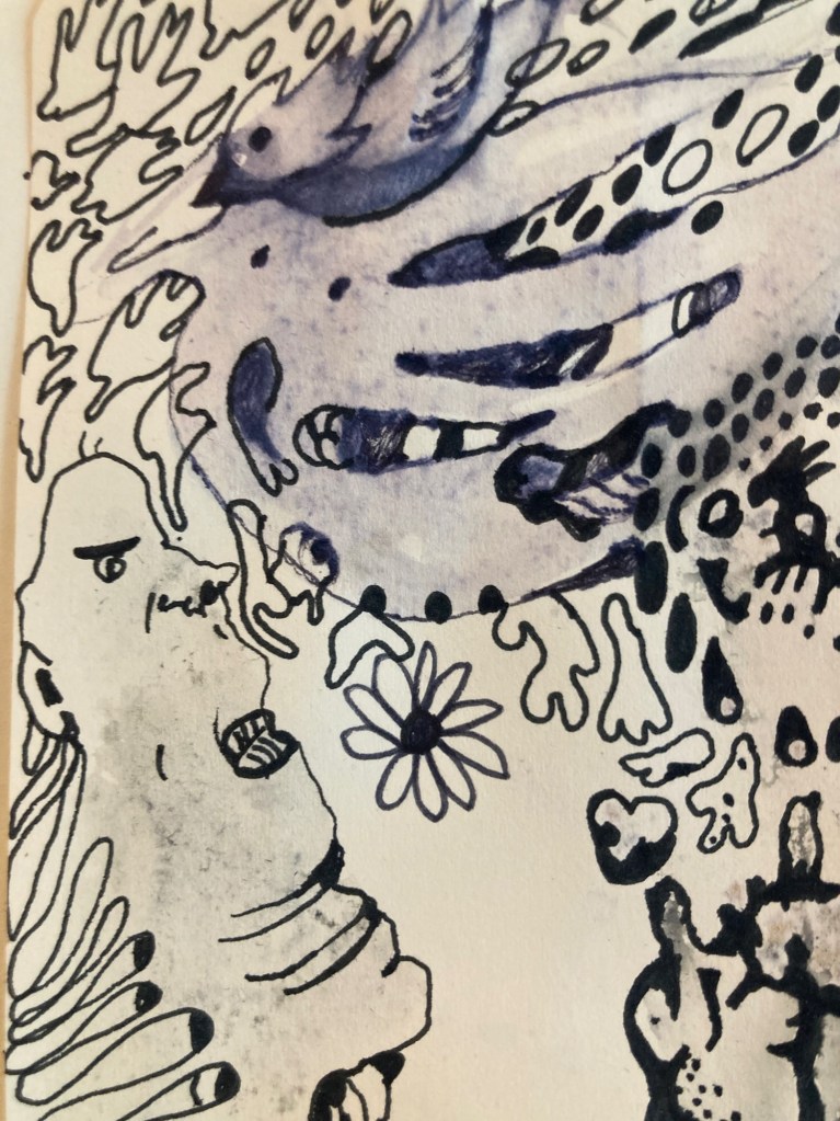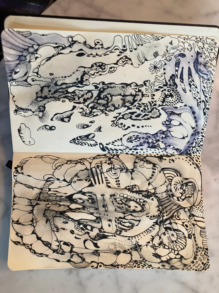 Den lilla svarta är nu blå och är en gammal dagbok från 80-talet som dök upp i utrensningen av fritidshuset. Jag hade visst inte så mycket att anförtro min dagbok just då så bara några sidor var använda. Nu blir det tuschteckningar i den i stället.