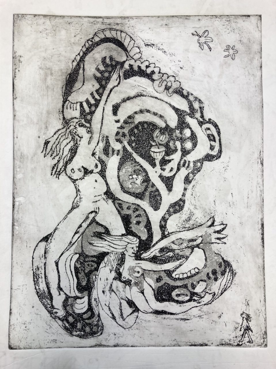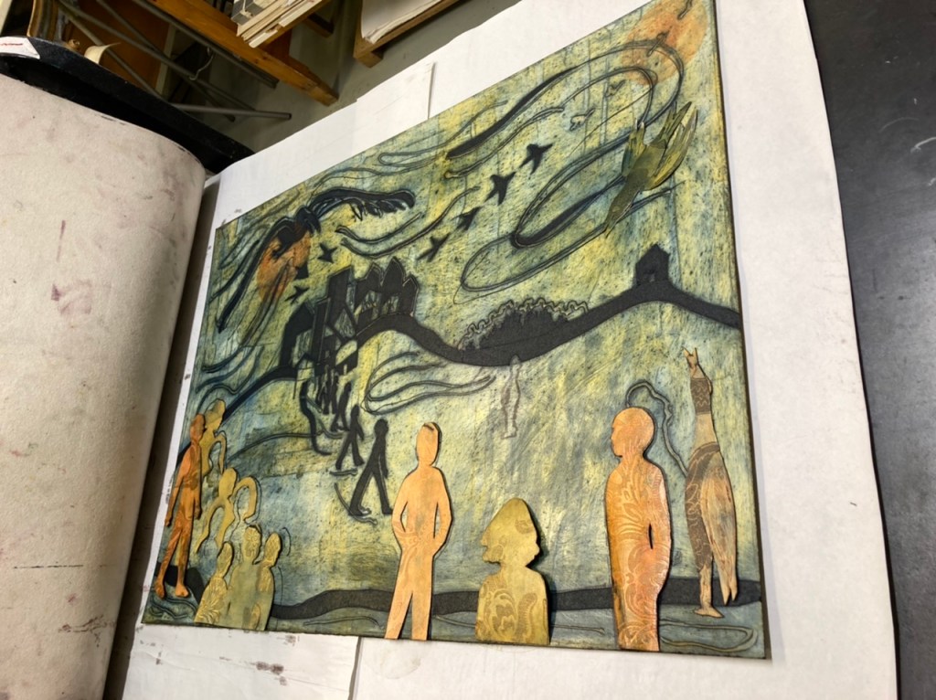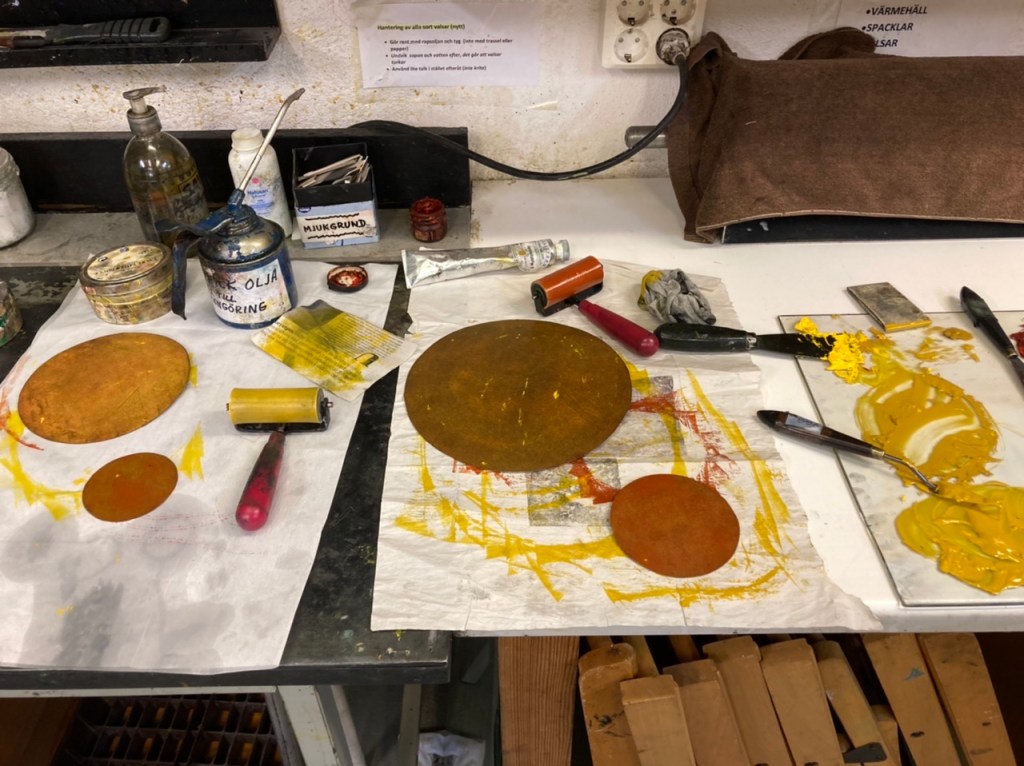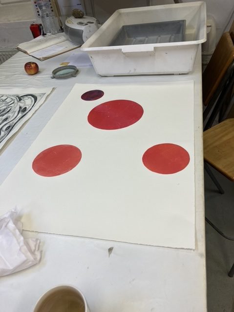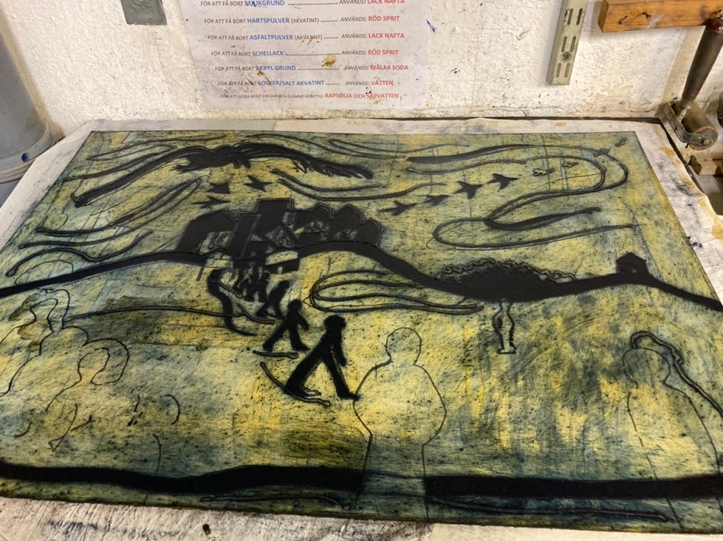 Inställd middag blev till helkväll i verkstan. Hade förberett dagen innan och etsat en plåt samt lackat en kartong för limtryck, så nu var det bara att trycka. Provtrycket av etsningen gick i ett nafs när jag väl hade pressat ut absolut allt som fanns kvar i färgtuben. Den stora kartongen krävde lite mer jobb i och med att det är fler element och därmed moment. Tryckte tre när jag ändå var igång. Får se om de hittar ett hem.