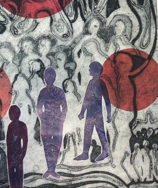 En insats för att rädda ett tekniskt lyckat men bildmässigt misslyckat tryck. Testar lite med kombinationer av mina abstrakta plåtar, men hittar inte riktigt fram. De trogna gamla gubbarna fick komma fram ur lådan igen.