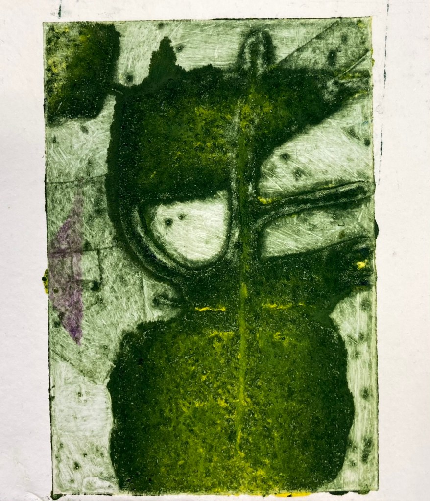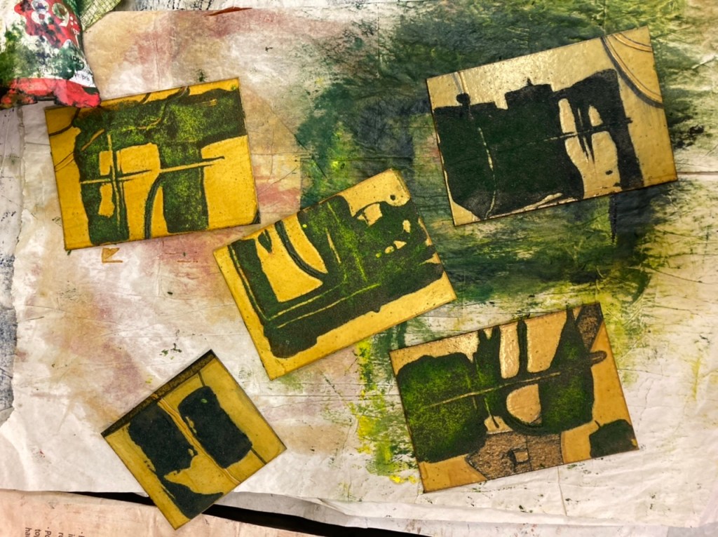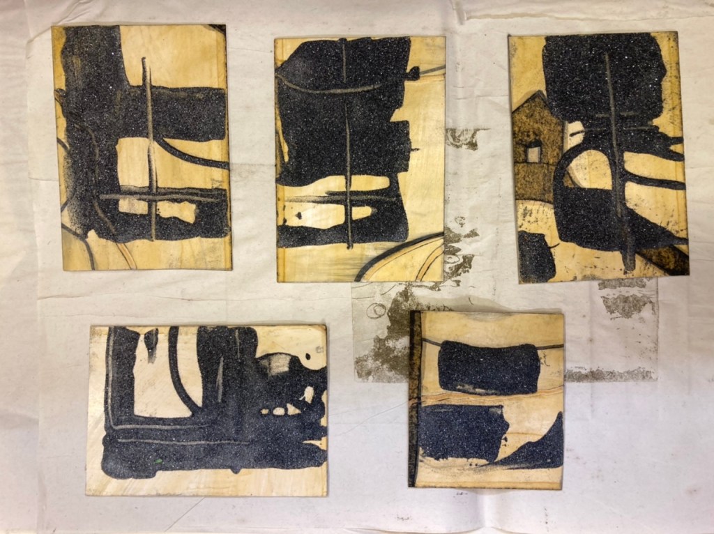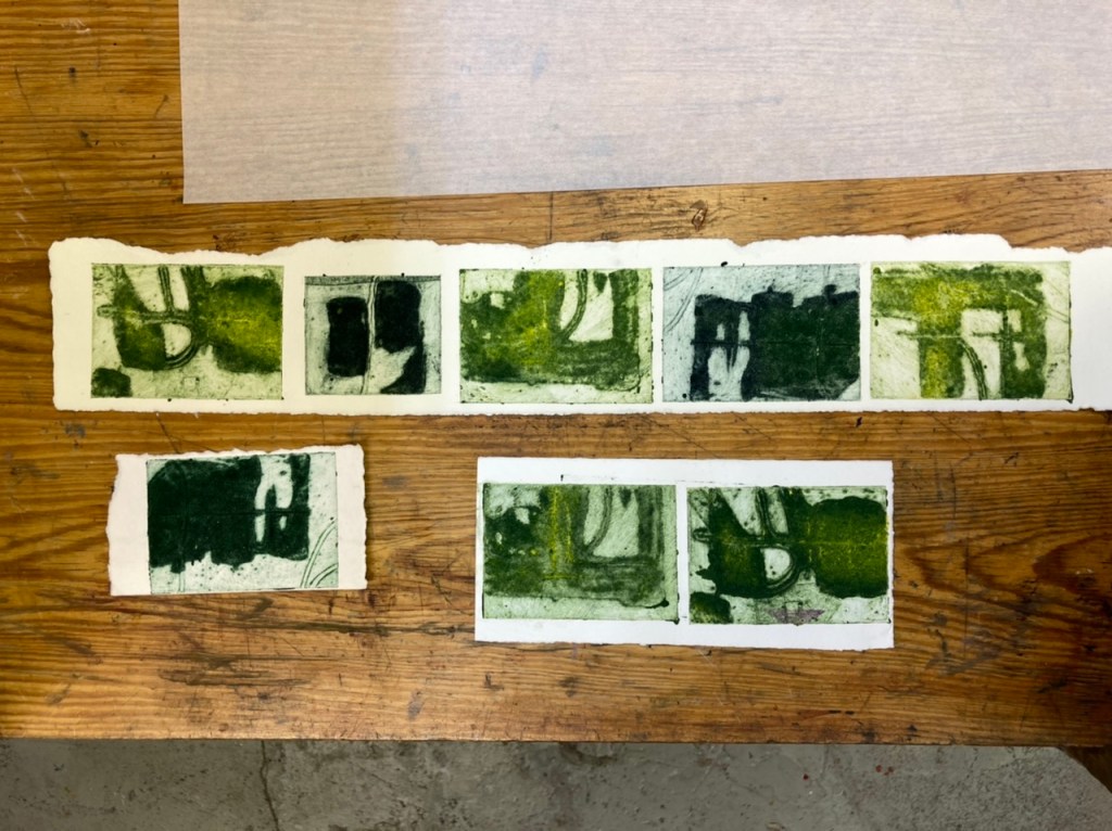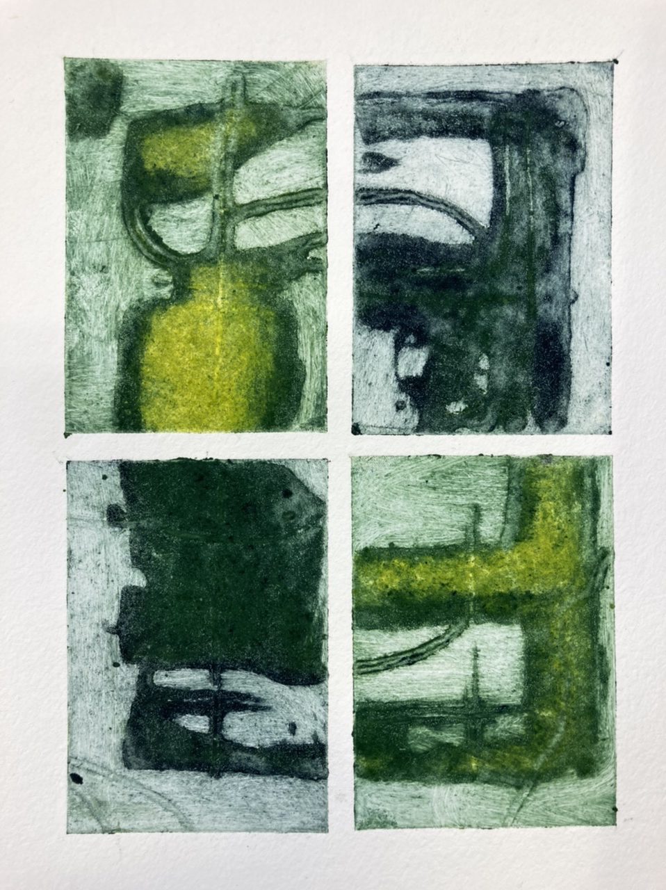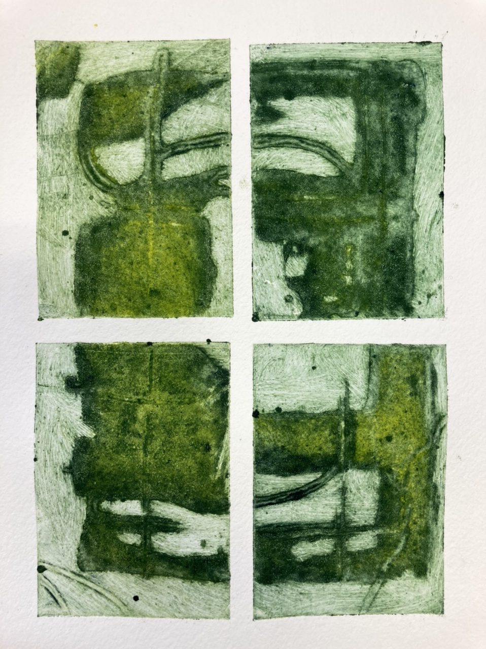 Jag har en plats i skogen med så otroligt vacker grön mossa, det är den som går igen här. Fyra (5) små plåtar som kan kombineras. En klarar sig fint på egen hand. Kartongerna är återbruk från tidigare tryckplåtar, här med lim och karborundum.