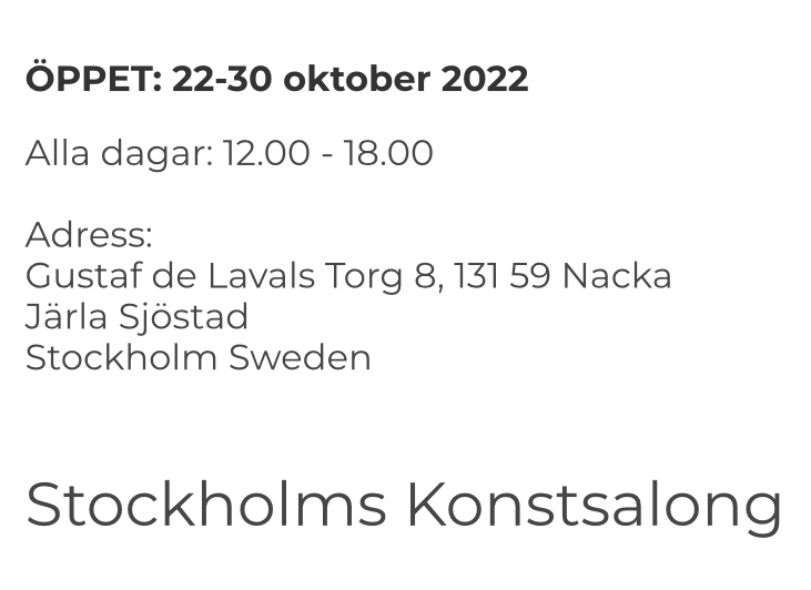 Utställningens öppettider 19 augusti – 9 september, onsdag-fredag kl. 12-18, lördag kl. 11-16. (söndag-torsdag stängt).