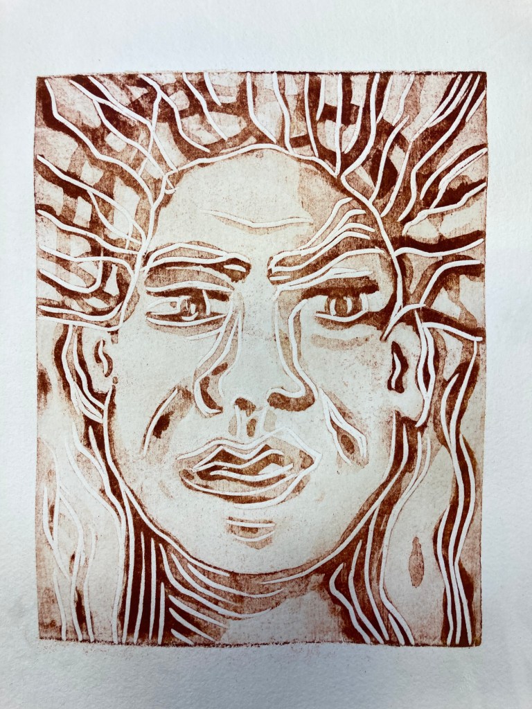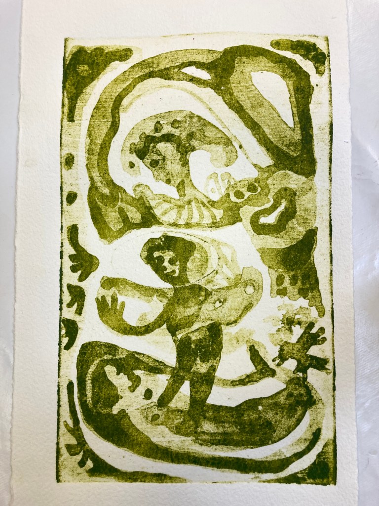 Jag testade också att stöta och blöta litokrita och målade på med det. Det såg riktigt bra ut på plåten, men blev lite smutsigt i trycken. Inte säker på varför. Enligt min mokulitoguru Bernard Cociancig ska destillerat vatten användas, vilket jag inte gjorde. Jag kombinerade sedan de två plåtarna. Tyvärr hade jag inga nålar, vilket är det bästa för att passa papperet. Eftersom resultatet blev så grötigt bättrade jag på med träsnitt. Det lyfte trycket betydligt. Den sista bilden visar ett tryck där jag först tryckt den ursprungliga plåten i rött och sedan tryckt på med den snittade i blått.