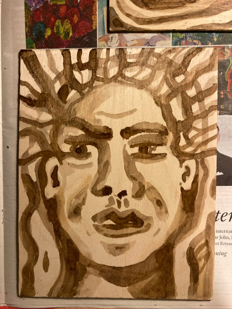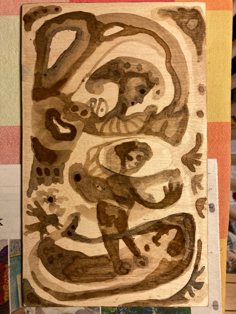 Tecknat bilder på fem plåtar, tre med oljebaserad marker och tre med litokrita. Talkat dessa och sedan duttat på gummi arabicum med svamp, det är att etsa in bilden i trät. Nu ska det ligga och etsa ett par dygn.