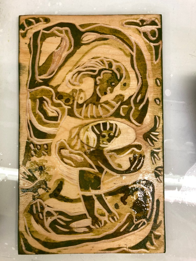 Marker var bra, men även där måste man se till att verkligen trycka in färgen i trät, det duger inte att teckna snabbt och ytligt. På trycket nedan har jag också snittat plåten.