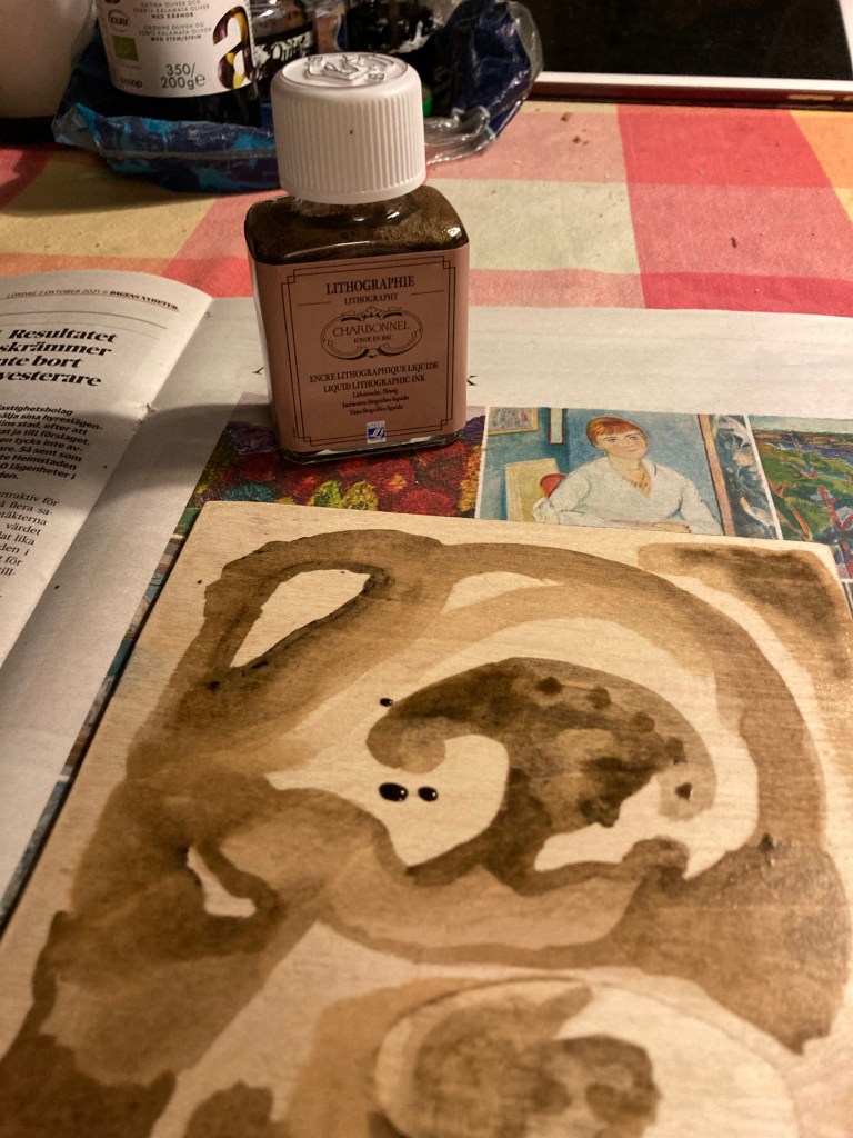 Då inget litotusch fanns att uppbåda i hela Stockholm bestämde jag mig för att testa att måla träplåten med vanlig oljefärg i stället. Själva principen är ju att fett ska gå in i trät. Det funkade fint. Lite oklart om det går att få till stånd några nyanser, det verkar vara den huvudsakliga fördelen med tuschet. Annars tycks den främsta nackdelen vara att det tar längre tid för oljefärgen att gå in i trät och torka tillräckligt för att det ska gå att arbeta vidare. Resultatet syns här: