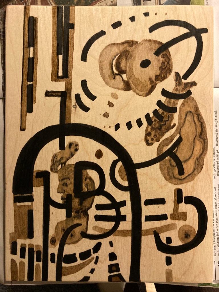 Tecknat bilder på fem plåtar, tre med oljebaserad marker och tre med litokrita. Talkat dessa och sedan duttat på gummi arabicum med svamp, det är att etsa in bilden i trät. Nu ska det ligga och etsa ett par dygn.