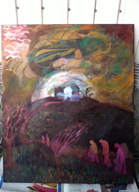 Återvinning av en upphittad uppspänd duk. Originalet är målat i olja så det är bara att fortsätta med det. Först en grundning så att jag inte ska bli så distraherad av motivet och sedan dags att bestämma sig för nytt motiv. Jag väljer att arbeta utifrån en skiss som jag gjorde för ett tag sedan i min gröna anteckningsbok. Färgerna har stelnat till lite eftersom jag målar i olja så sällan. Nu gäller det att passa på att göra klart innan det blir kallt ute för jag klarar inte av att måla i olja inomhus.