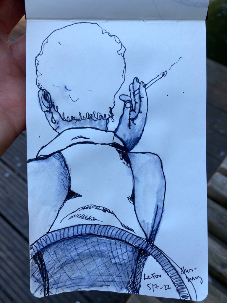 Det var skuggigt på södra flodbanken av Ill, så en teckning blev det, och så ett par kafébagateller från mitt favoritfik Le roi et son fou.