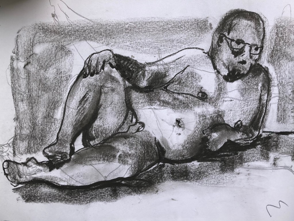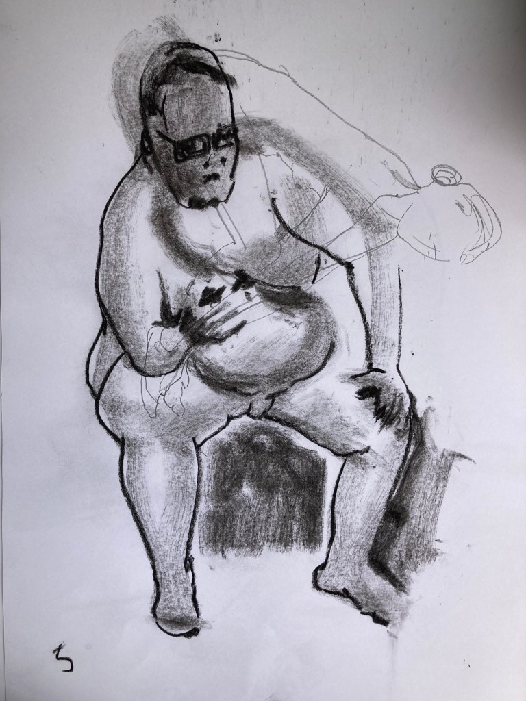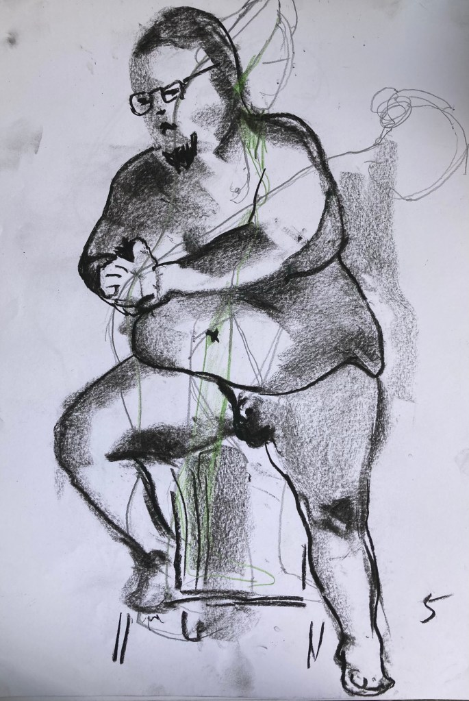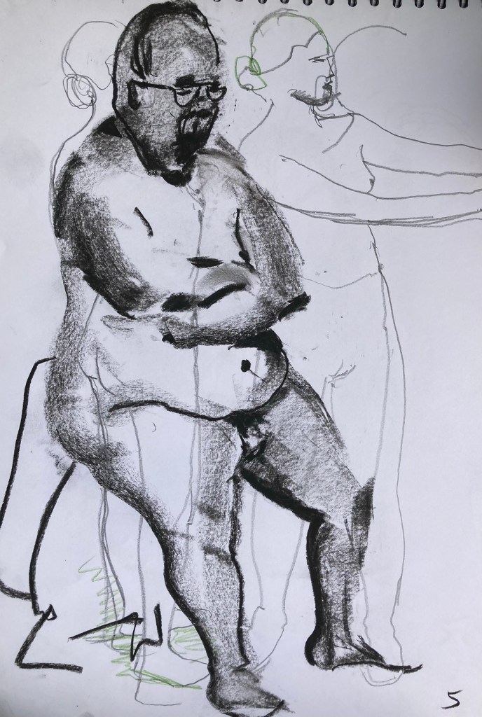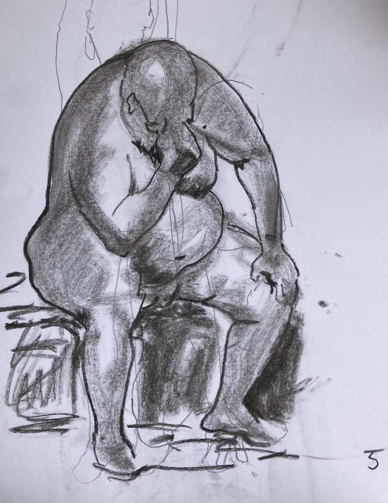 Jag hade träffat rätt i val av material när jag premiärtecknade på Meldrums kroki på Dieselverkstan. Först ett mycket och sedan ett ganska mjukt kol. Det var kul, lite annorlunda med så stora volymer. Tecknade hyfsat stort på A3.