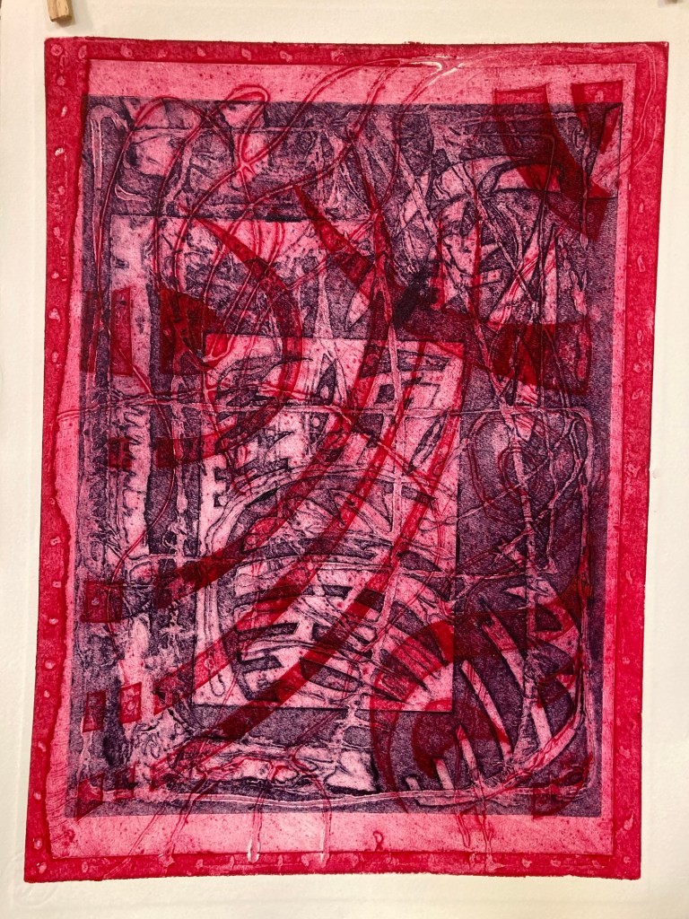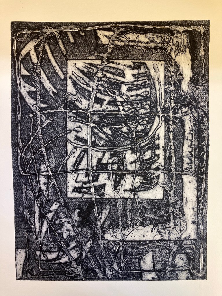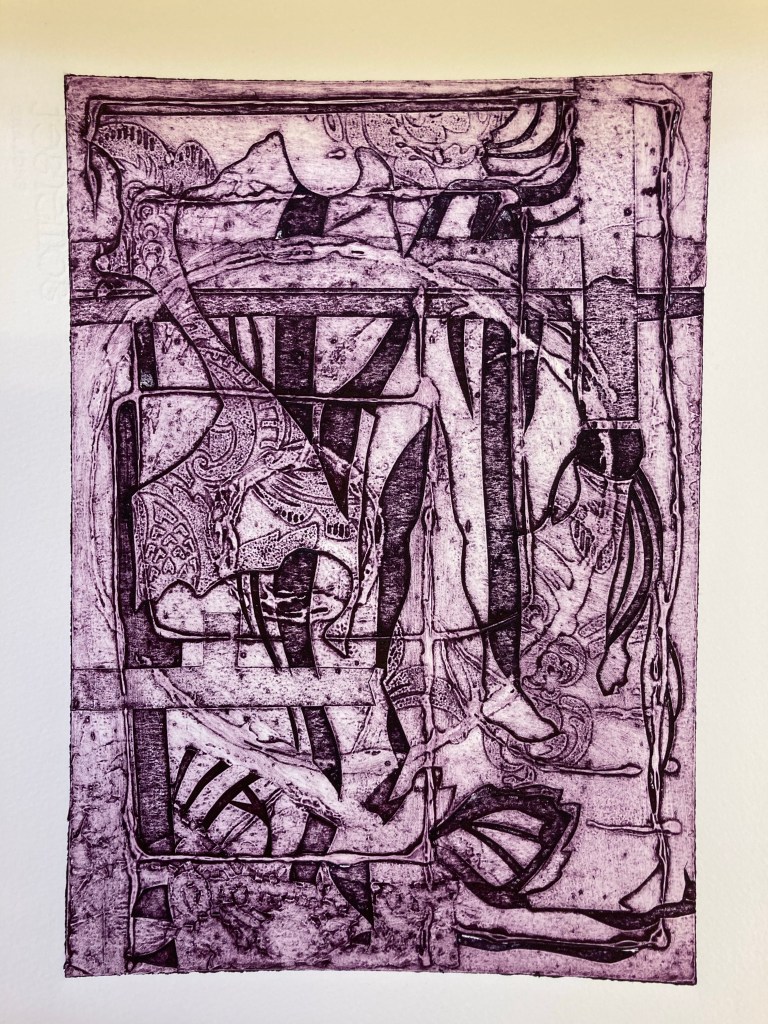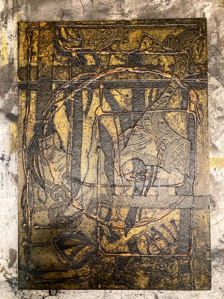 En insats för att rädda ett tekniskt lyckat men bildmässigt misslyckat tryck. Testar lite med kombinationer av mina abstrakta plåtar, men hittar inte riktigt fram. De trogna gamla gubbarna fick komma fram ur lådan igen.