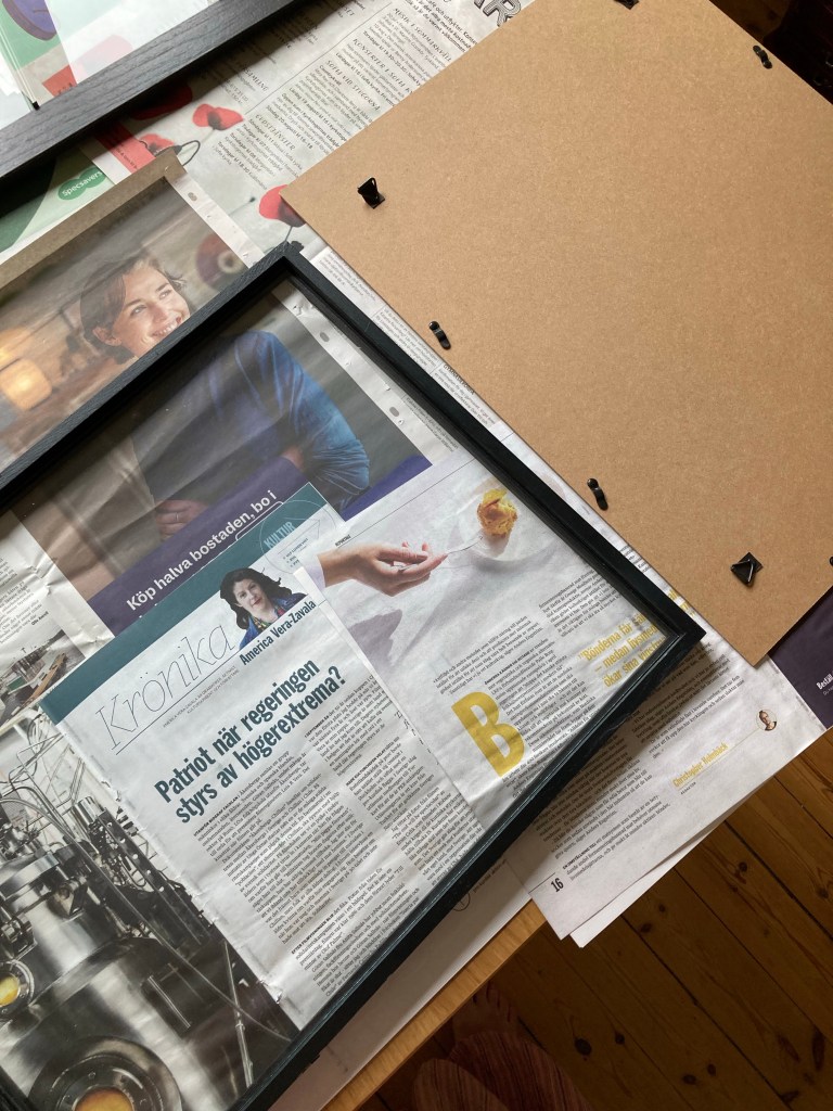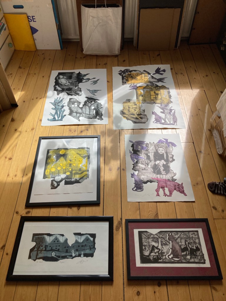 Jag förbereder i sista minuten. Återanvänder ramar, fixar passepartouter, saknar tryck, åker till verkstan, cyklar med trycken i regnet, håhåjaja. Nä, klart blev det inte.